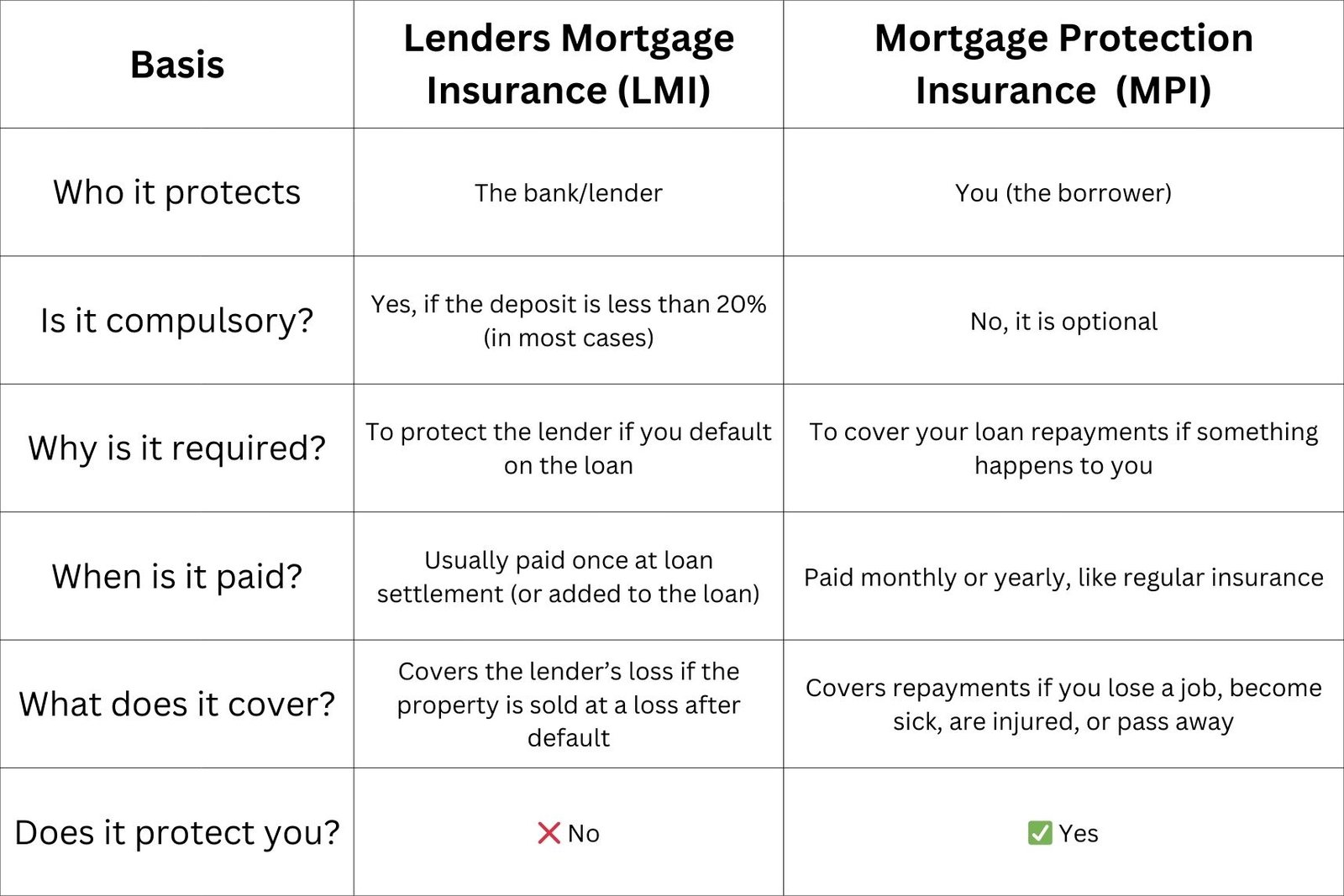 Lenders Mortgage Insurance (LMI) protects the lender, not you.